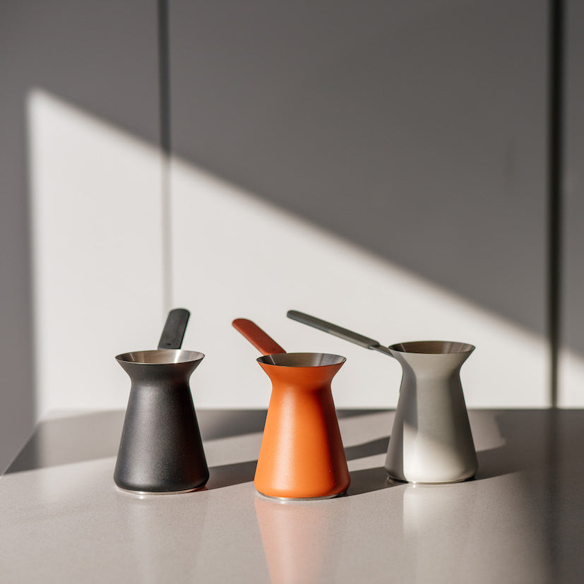 The Turkish preparation of coffee goes back centuries and during this time a specific shape of the container for its preparation was developed, which is wide at the bottom and has a narrow neck and a wide spout.